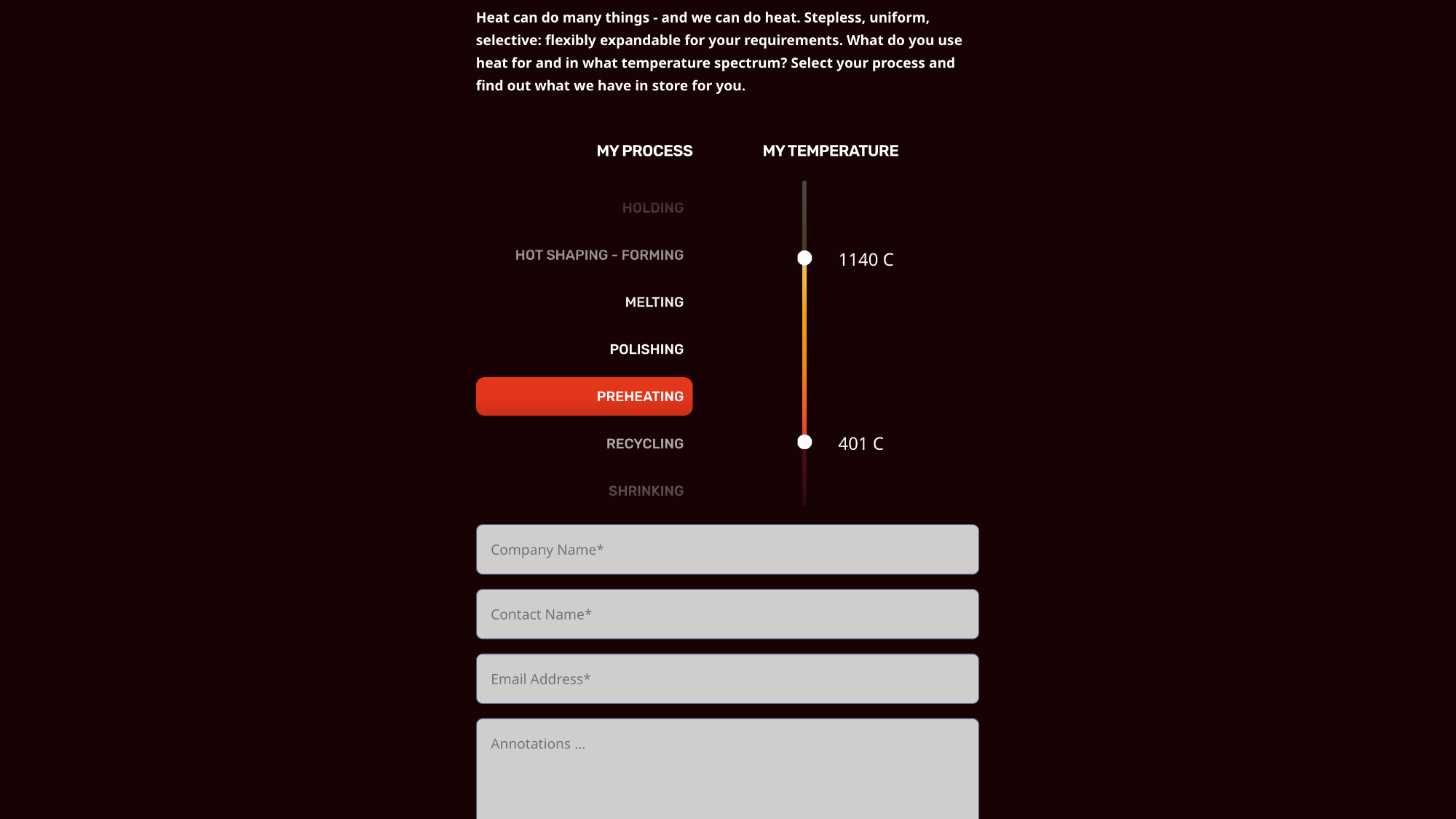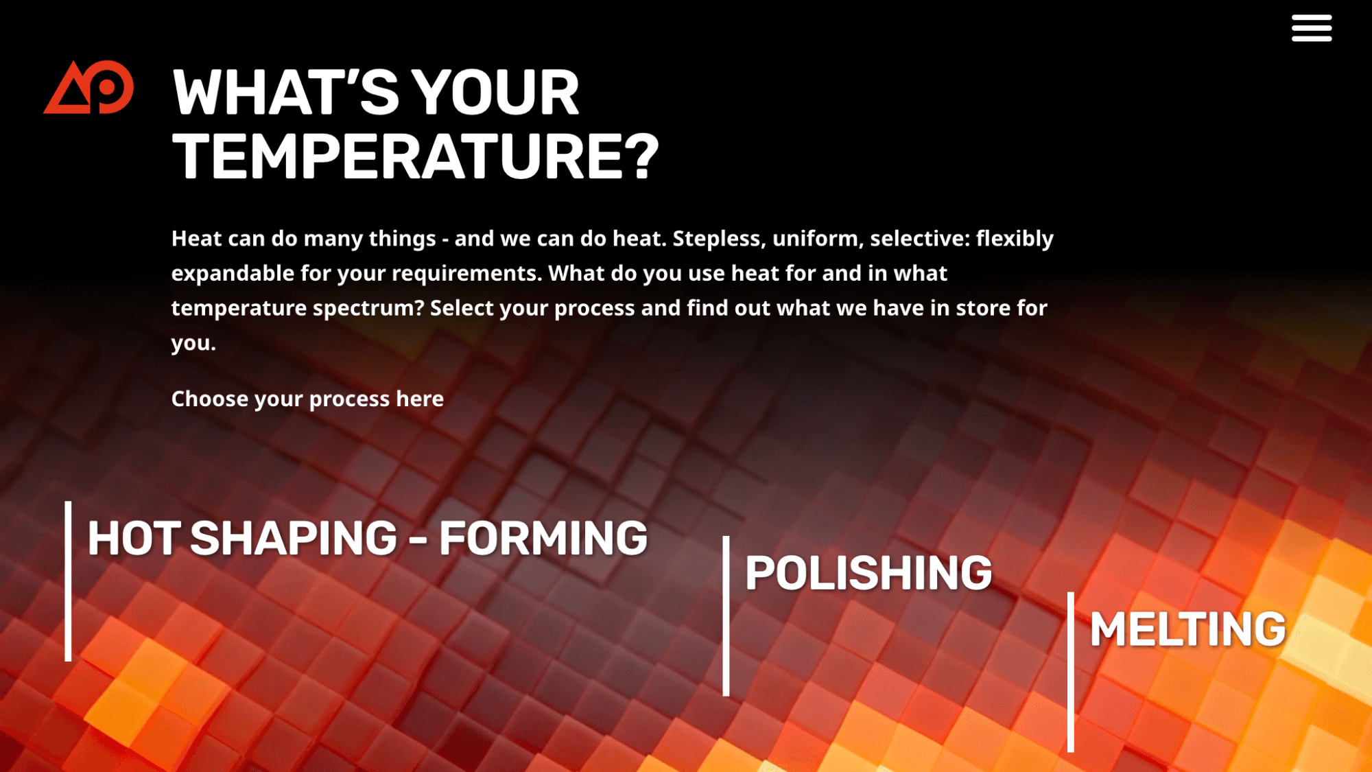 Technologien für Hitze und Wärme bedienen eine große Bandbreite: Von der industriellen Lebensmittelproduktion bis zur Stahlschmelze ist alles dabei. Ein Anbieter sowohl individueller als auch serienmäßiger B2B-Lösungen braucht eine klare Sprache, die diese Komplexität greifbar macht. Für den europaweit tätigen Hidden Champion im Bereich flammenfreier Hitzetechnologie haben wir mit der promeos Heatmap eine Bild- und Kommunikationswelt geschaffen, die Prozesse und Temperaturbereiche von 100 bis 1400 °C visuell vermittelt. Der Claim “What’s your Temperature?“ übersetzt die angebotene Bandbreite in eine einfache Frage, mit der B2B-Kunden sich anhand ihrer individuellen Anforderungen verorten können – vom Backen oder Warmhalten von Food-Produkten bis hin zu Hightech-Schmelzprozessen in der Metallverarbeitung.
