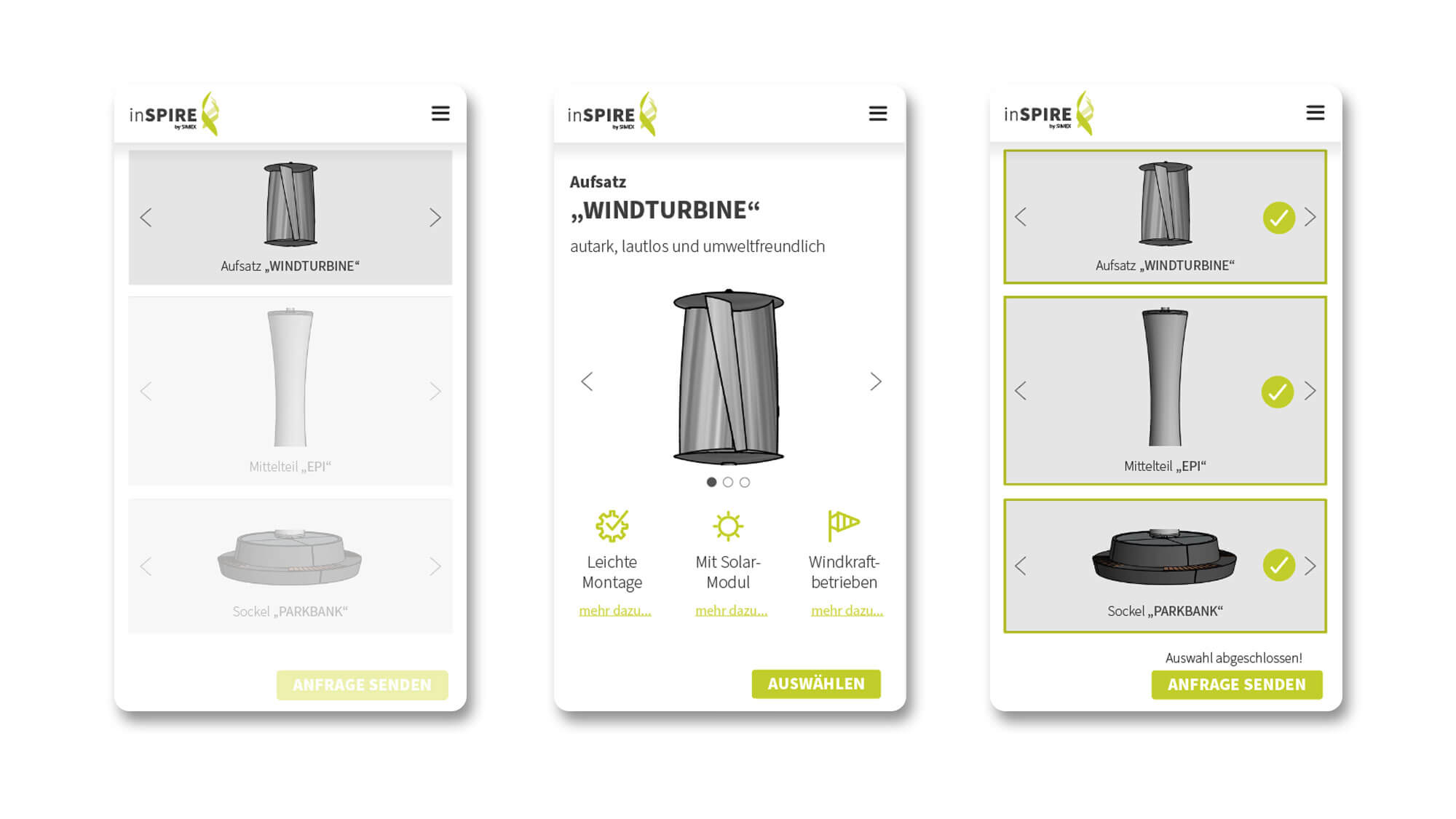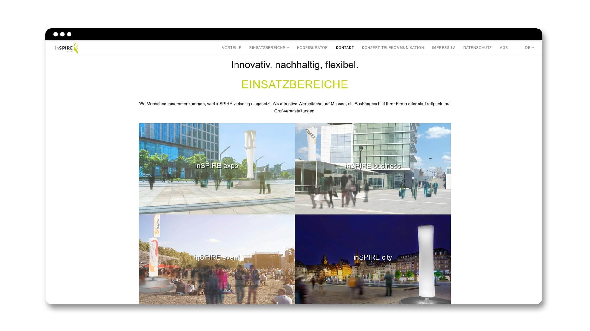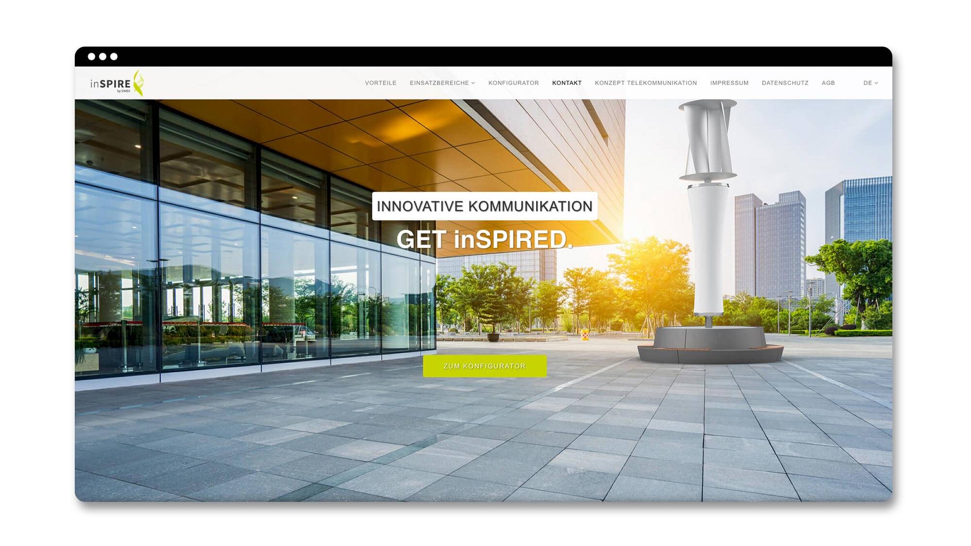 Für dieses neuartige Produkt entwickelten wir den Namen inSPIRE – inspiriert von Turmform und Hotspot-Funktion. Logo, Farbwelt und Styleguide übersetzen das technische System in eine markenfähige Identität. Auf der begleitenden Website wird inSPIRE in Anwendungsszenarien erlebbar, Vorteile werden klar herausgestellt und über einen Konfigurator können Interessierte direkt ihre individuelle Anlage anfragen.